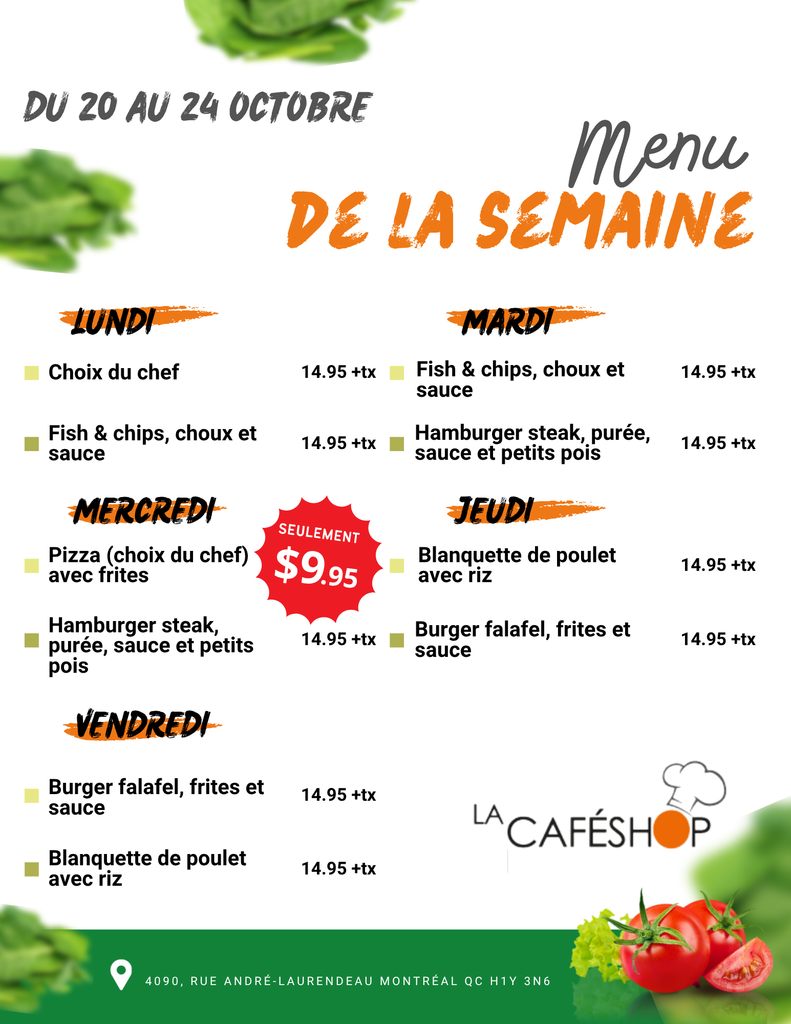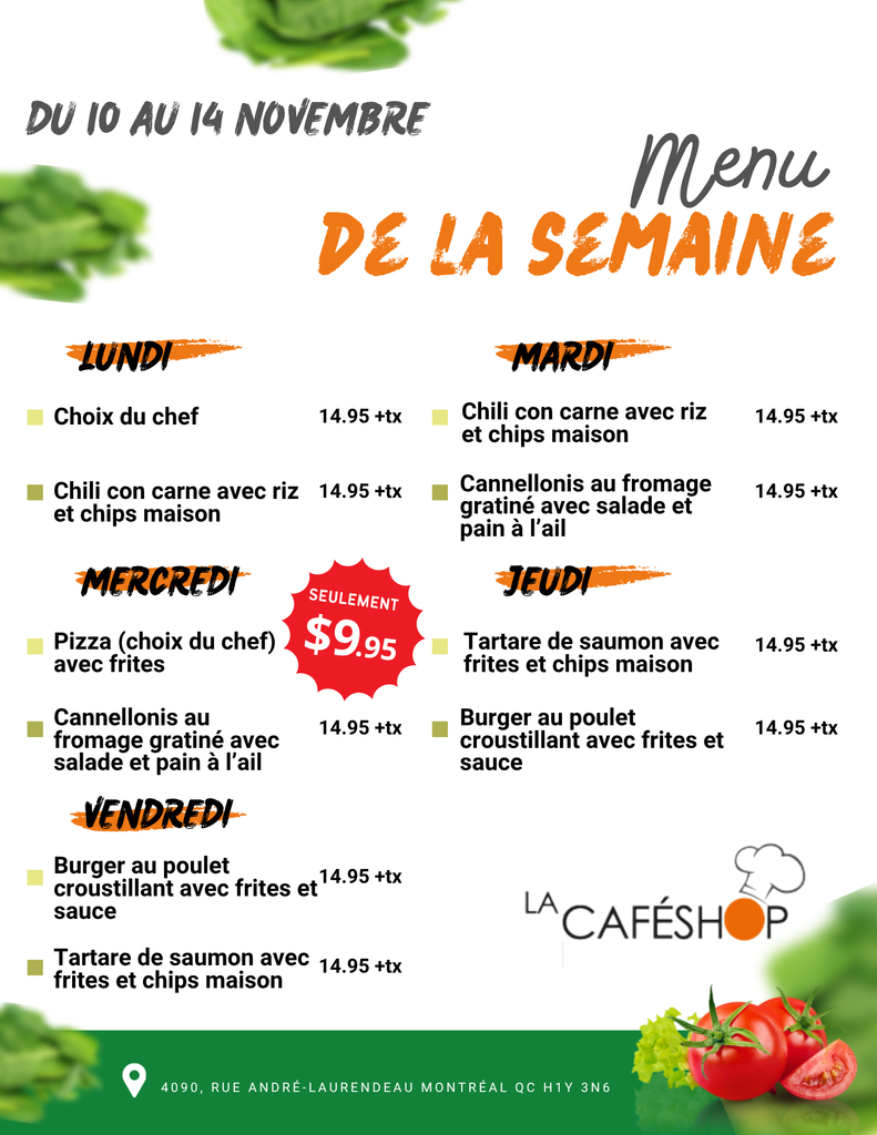 Chaque semaine, nous vous proposons un nouveau menu à La Caféshop.